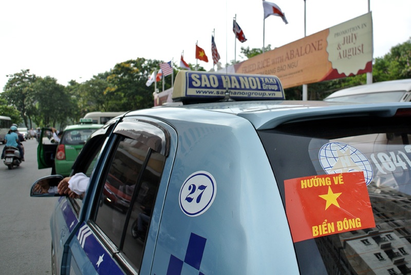 | Nhiều hãng taxi ở Hà Nội dán hình cờ Tổ quốc cùng dòng chữ khẳng định tấm lòng người dân với biển đảo. |