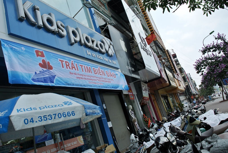 | Một cửa hàng kinh doanh đồ trẻ em trên phố Xã Đàn giăng pano kêu gọi mọi người chung tay, góp sức xây dựng, bảo vệ biển đảo của Tổ quốc. |