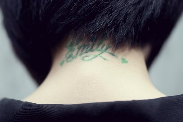 | Hot girl - nữ ca sĩ trẻ Hà thành Emily cũng có một hình xăm tên mình ngay sau gáy, nằm giữa hai hình trái tim màu xanh khá nữ tính. |