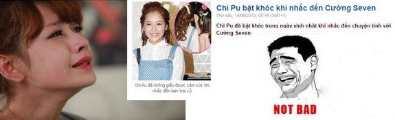 | Sau thông tin Chi Pu chính thức chia tay mối tình 3 năm - Cường Seven hồi tháng 5 vừa qua, trào lưu chế ảnh cặp đôi này đã trở nên rầm rộ hơn bao giờ hết. Hình ảnh dân mạng lý giải lý do Chi Pu bật khóc khi nhắc đến người yêu cũ. |