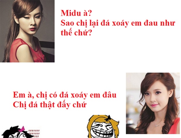 | Tiếp sau sự việc ồn ào đó, Midu - hot girl nổi danh học giỏi đã đăng tải bảng điểm Đại học với số điểm cao trong khi lịch diễn vấn dày đặc khiến cư dân mạng nể phục. Việc này không khỏi làm nhiều người nhớ đến những lời nói dối về việc học kém cỏi của Angela trước đó. Ảnh chế hai hot girl này đá xoáy nhau ra đời. |