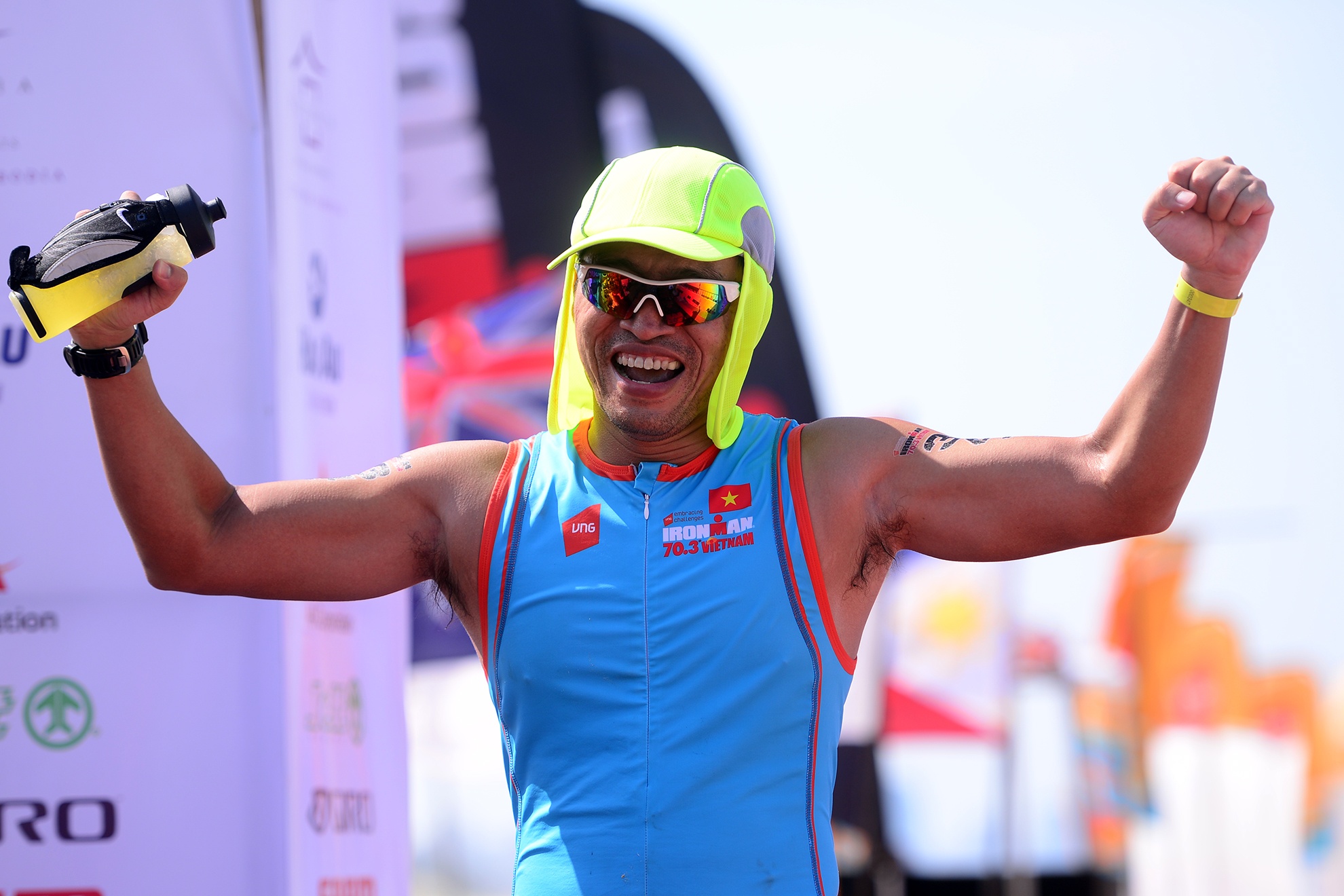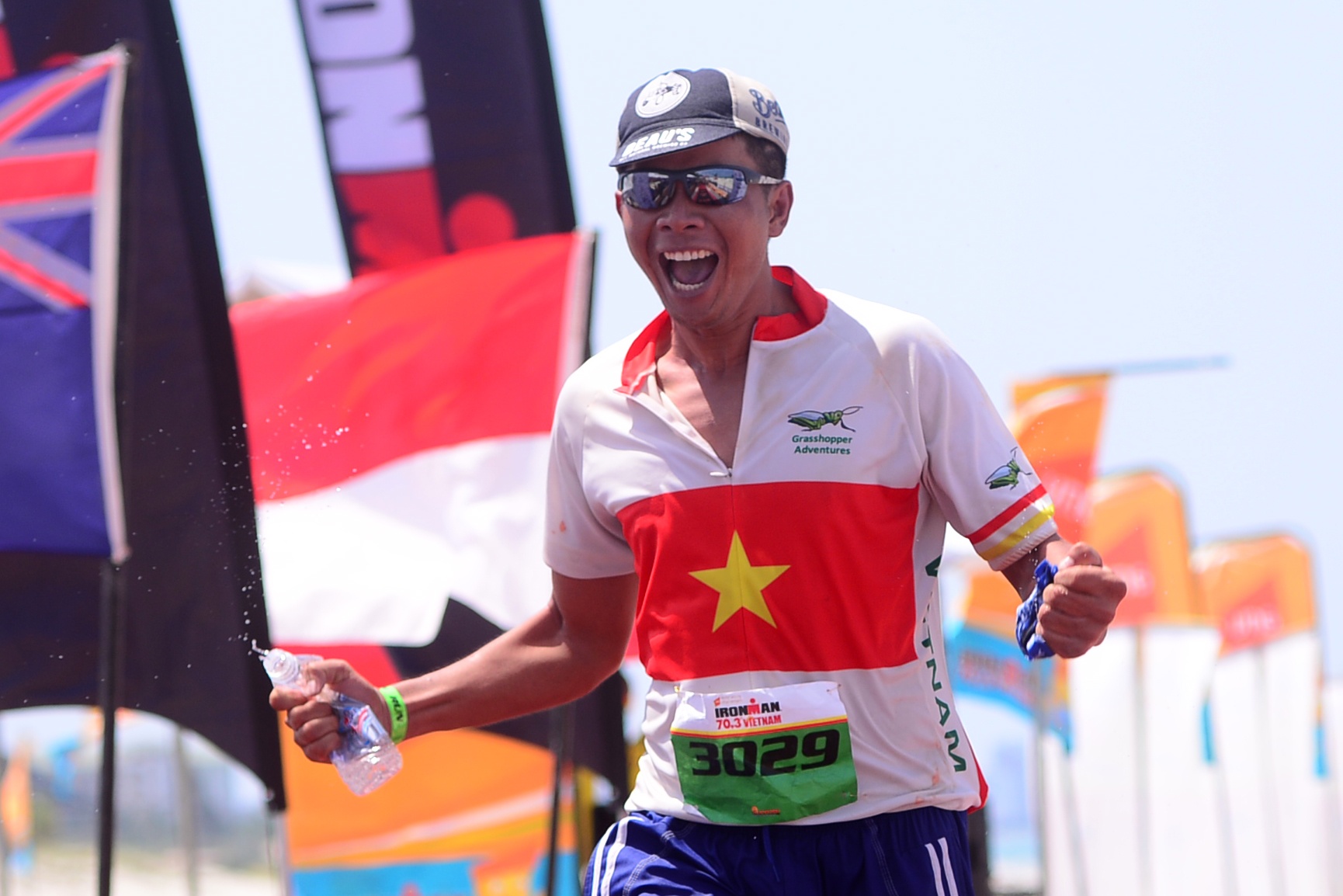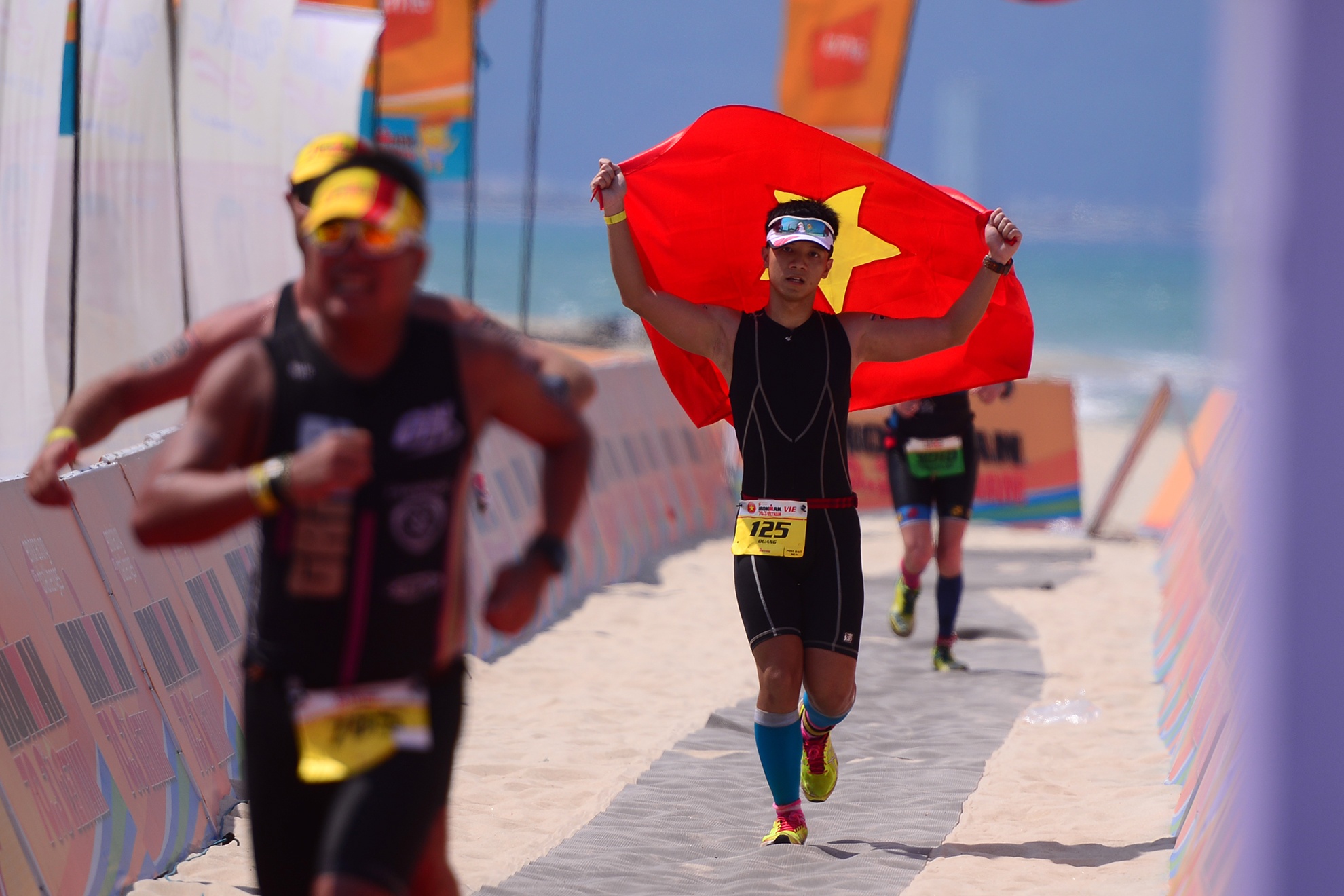 | Tại vạch đích, hầu hết các vận động viên Việt Nam kết thúc ba chặng đua trong khoảng thời gian dưới 8 giờ 30 phút. Anh Phạm Quang giơ cao lá cờ Tổ quốc khi về đích với thành tích tổng 7 giờ 38 phút 34 giây. |