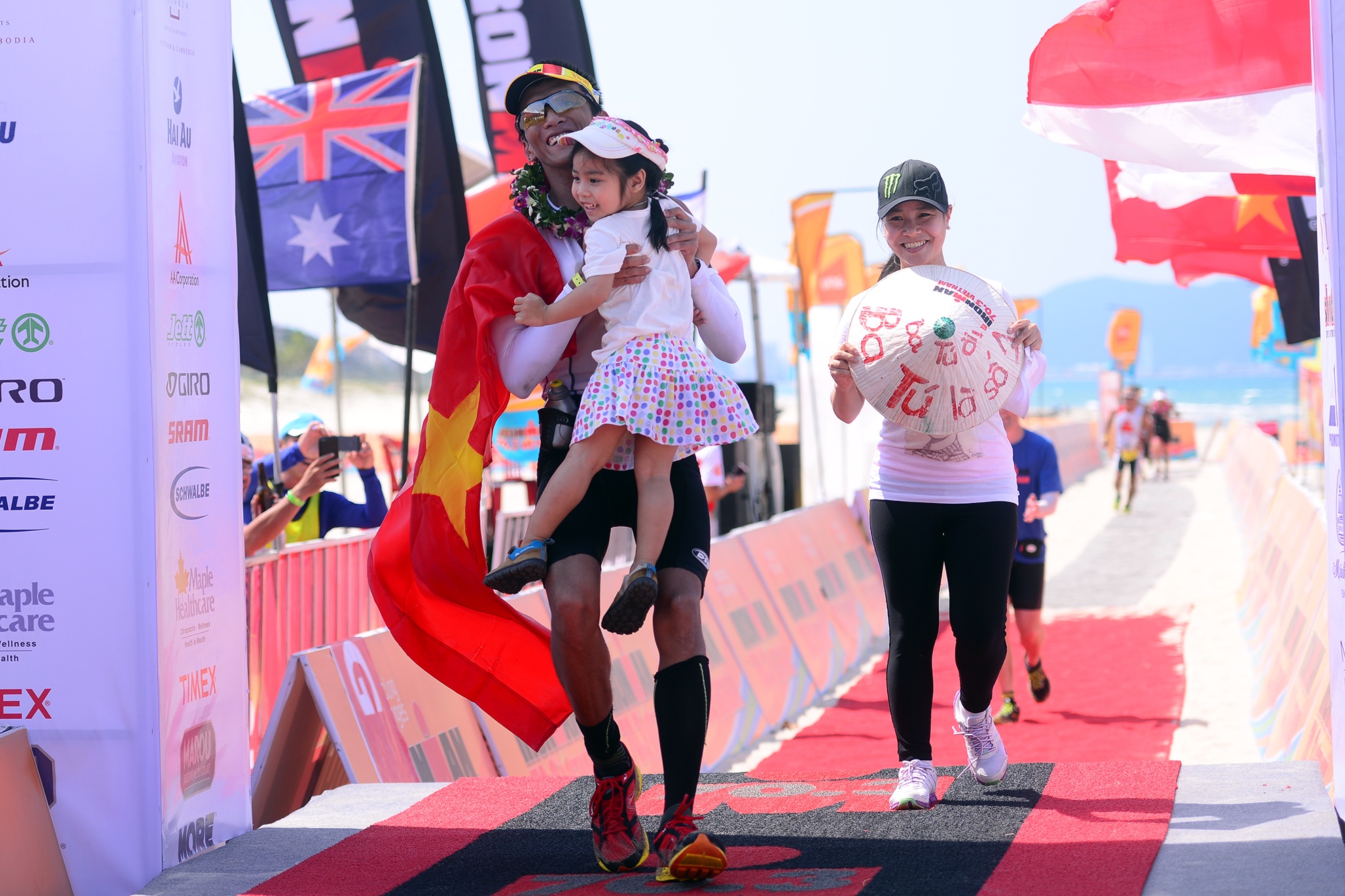 | Vận động viên Hoàng Tú kết thúc thành tích 3 môn của anh với thời gian 7 giờ 13 phút 04 giây. Anh hạnh phúc trong sự đón chào của vợ và con gái trong quãng đường về đích. |