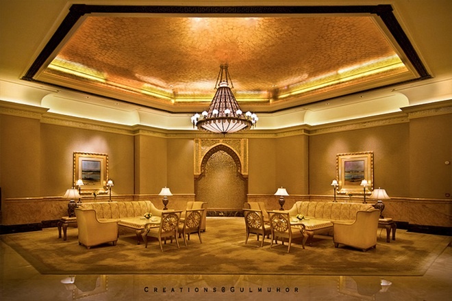 | Phòng suite của khách sạn được phủ đá cảm thạch và dát vàng, đem lại cảm giác xa xỉ tuyệt đối. Trong hình là tiền sảnh với tông vàng xa hoa. |