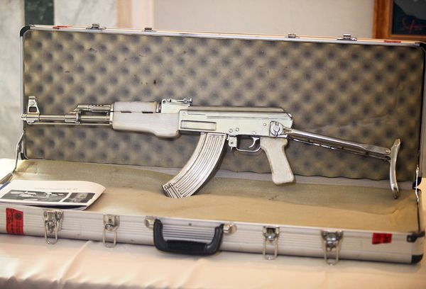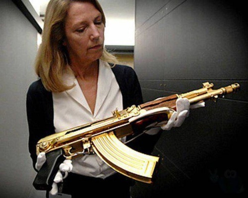 Một khẩu Kalashnikov AK-47 dát vàng của cựu tổng thống Iraq Saddam Hussein đang được trưng bày tại Bảo tàng Chiến tranh Australia. Nó nằm trong bộ sưu tập những hiện vật chiến tranh sau năm 1945. Theo đại diện bảo tàng, khẩu súng này có thể bắn bình thường. Nó được sản xuất tại Tabuk, Iraq. Nó thường được vệ sĩ thân cận của Saddam Hussein mang theo. Ảnh: News.com.au |