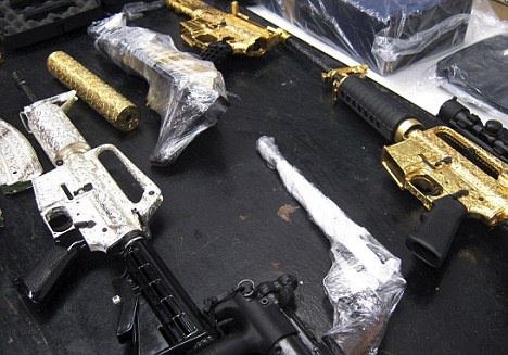 Những khẩu súng trường tấn công do Mỹ sản xuất được dát vàng và bạc. Binh sĩ Mexico tịch thu hơn 30 vũ khí loại này trong một đợt truy quét. Ảnh: Reuters |