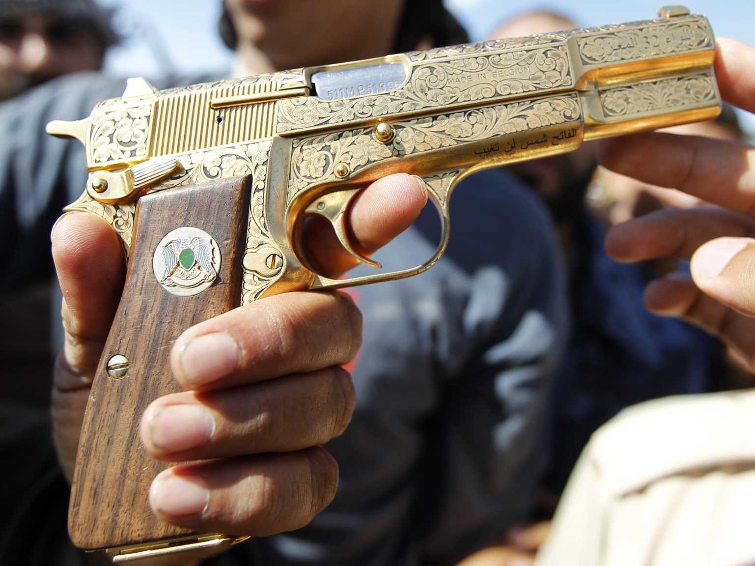 Trong 42 năm cầm quyền, nhà lãnh đạo Libya Muammar Gaddafi luôn mang bên mình một khẩu súng lục bằng vàng. Khi ông bị bắn ngày 20/10/2011, một tay súng nổi dậy đã tìm thấy khẩu súng bên mình người đàn ông từng được coi là anh hùng dân tộc Libya. Hiện nay, người ta chưa thể xác định được số phận khẩu súng, BBC đưa tin. Ảnh: Daily Mail |
