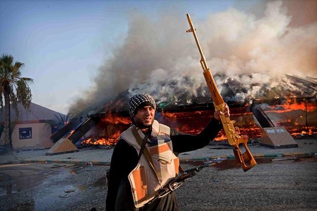 Theo tờ Times của Anh, một tay súng phát hiện khẩu súng ngắm Dragunov dát vàng khi phá hủy nơi ở của Gaddafi trong tháng 8/2011. Ảnh: Thetimes.co.uk |