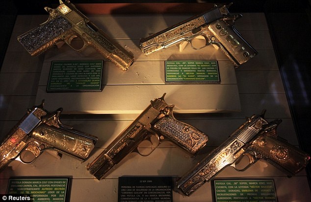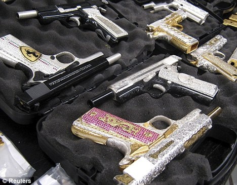 Những khẩu súng lục dát vàng, đính kim cương hoặc các loại đá quý thuộc sở hữu của băng đảng Valencia, liên minh của tổ chức buôn bán ma túy Sinaloa khét tiếng tại Mexico. Ảnh: Reuters |