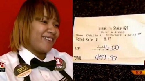 Theo những gì được đăng tải trên trang blog người nữ bồi bàn may mắn. Vào một ngày bình thường, cô được cho số tiền típ lên tới 1.000 USD bởi người khách lạ mặt sau khi nghe câu chuyện cảm động phải xa quê hương của nữ bồi bàn. 1000 đô tiền típ, trong khi hóa đơn tính giá bữa ăn chỉ ghi 60,42 USD.
