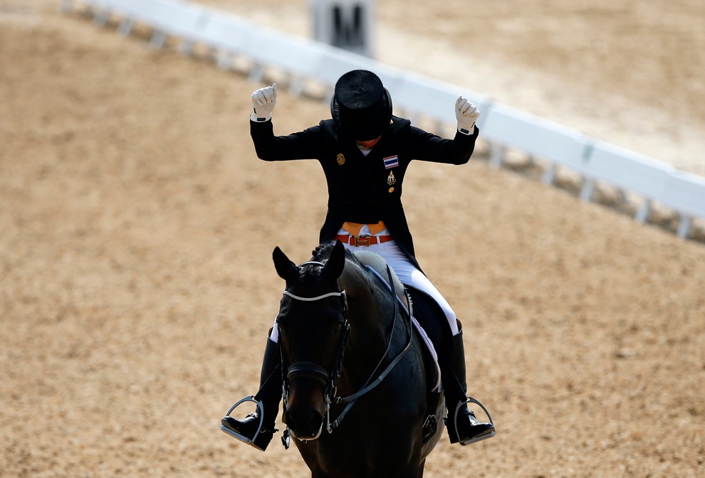 | Công chúa Thái Lan, Sirivannavari Nariratana vui mừng sau khi hoàn tất bài thi ở môn đua ngựa vượt chướng ngại vật. |