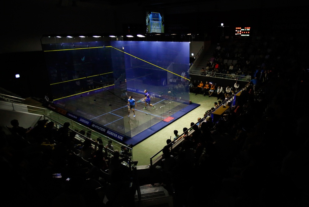 | Abdullah Almezayen (Kuwait) và Ghosal Saurav (Ấn Độ) tranh tài ở trận chung kết squash cá nhân nam. |