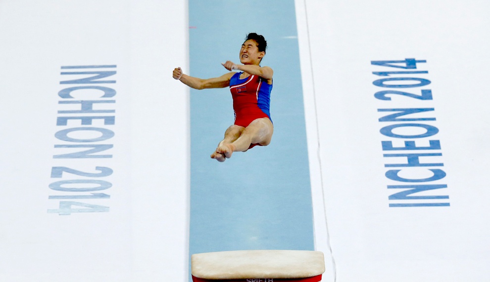 | VĐV Hong Un-Jong (CHDCND Triều Tiên) thực hiện bài thi nhảy ngựa. |