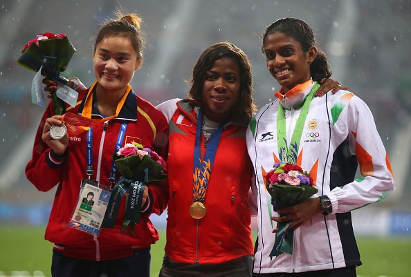 | VĐV Quách Thị Lan (ngoài cùng bên trái) nhận HCB nội dung chạy 400 m nữ. |