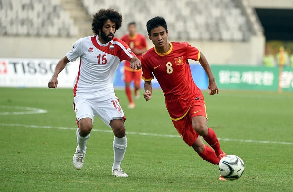 | Tiền vệ Vũ Minh Tuấn nỗ lực đi bóng trong trận đấu thuộc vòng 1/8 môn bóng đá nam giữa Olympic Việt Nam và Olympic UAE. |