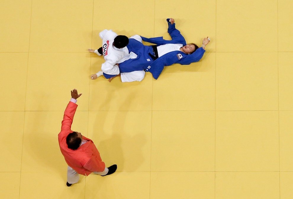 | Choi Gwang-hyeon (Hàn Quốc - áo trắng) và Azamat Mukanov (Kazakhstan - áo xanh) so tài quyết liệt ở một trận chung kết bộ môn Judo. |