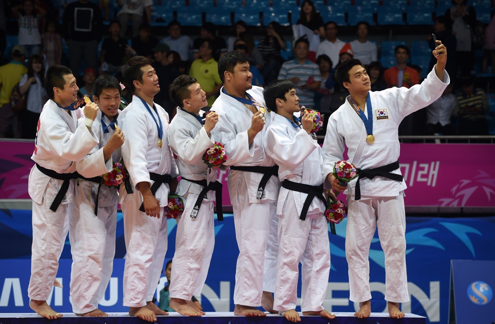 | ĐT judo nam Hàn Quốc thực hiện màn "chụp ảnh tự sướng" trên bục nhận HCV nội dung đồng đội nam. |