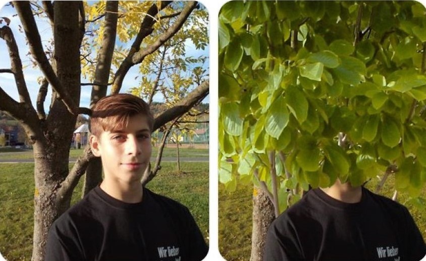 Hoặc với những yêu cầu là cắt bớt hoặc thêm vật thể, James sẽ khéo léo làm nó biến dạng hơn hoặc che khuất luôn người và các vật xung quanh. Như trong 2 bức ảnh này, khi cô gái nhờ đặt một quả cầu vào tay và kết quả nhận được là khuôn mặt của cô cũng bị méo mó theo. Hay với bức ảnh chàng trai nhờ thêm lá vào thân cây, bậc thầy photoshop đã sẵn tay giúp cậu che giấu thân phận luôn. |