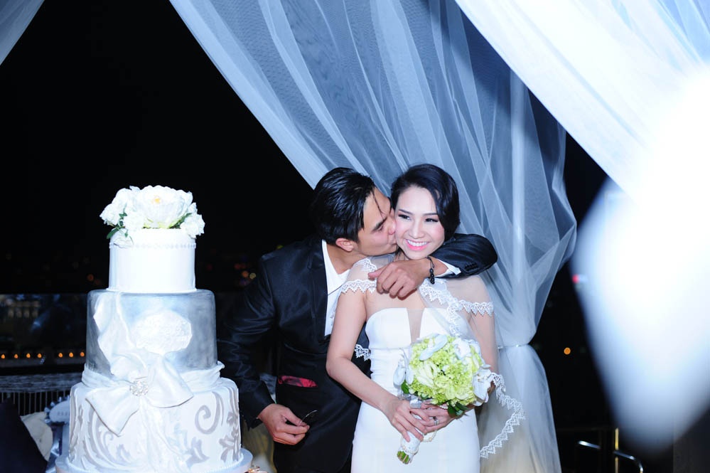 Baggio đặt nụ hôn nồng nàn lên má vợ. Là một trong những hot boy đào hoa nhất showbiz Việt, Baggio khiến nhiều người ngỡ ngàng khi quyết định "đeo gông vào cổ" ngay trong những ngày đầu tiên của năm 2014. Tuy nhiên, Quỳnh Trâm khẳng định cô không quan tâm với quá khứ đào hoa của chồng.