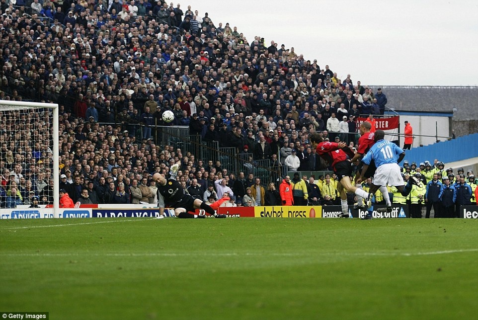 | Shaun Goater hạ gục Fabien Barthez với một cú đánh đầu trong chiến thắng 3-1 của Man City trước M.U ở trận lượt đi mùa giải 2002/03. Đây cũng là mùa giải cuối cùng, The Citizens thi đấu tại sân Main Road (tròn 80 năm tuổi) trước khi chuyển sang SVĐ mới, City Of Manchester. |