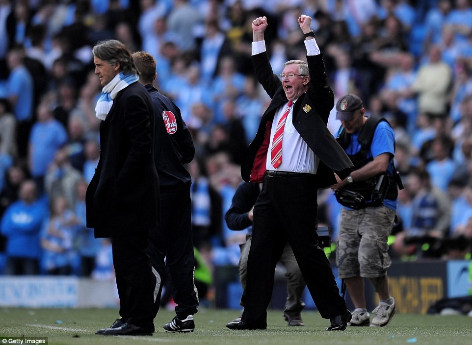 | Màn ăn mừng của Sir Alex Ferguson sau khi cậu học trò Paul Scholes ghi bàn thắng quyết định giúp Quỷ đỏ giành trọn 3 điểm ngay tại City of Manchester (mùa giải 2009/10). |
