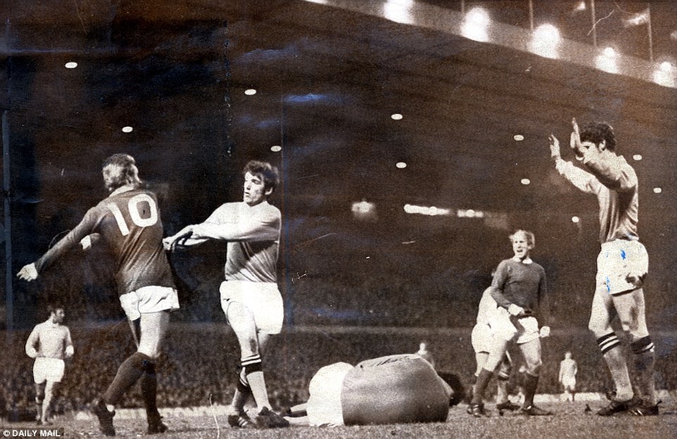 | Dennis Law (M.U) và Tommy Booth (Man City) có pha va chạm trong trận bán kết lượt về cúp Liên đoàn ở mùa giải 1968/69. Để Man City cầm hòa 2-2 trên sân nhà Old Trafford, M.U thua chung cuộc 3-4 và đành nhìn đối thủ cùng thành phố nâng cúp vô địch sau chiến thắng 2-1 trước West Brom ở trận chung kết. |