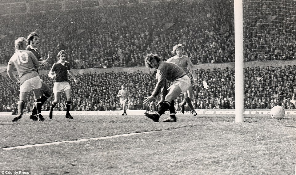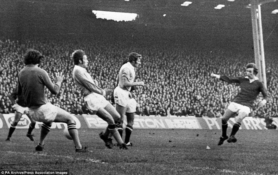 | Sammy McIlroy (M.U) tung cú sút hạ gục thủ thành Corrigan ở trận derby diễn ra vào tháng 11/1971. Trước sự chứng kiến của hơn 63.000 CĐV có mặt trên SVĐ Main Road, hai đội đã cống hiến một trận cầu hấp dẫn với 6 bàn thắng được ghi, chia đều cho mỗi bên. |
