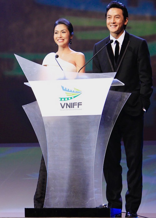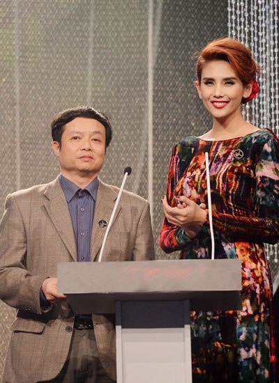 | Siêu mẫu Hoàng Yến cũng quá cách biệt về chiều cao khi trao giải thưởng cho các nhà làm phim tại lễ trao giải Cánh Diều Vàng. |