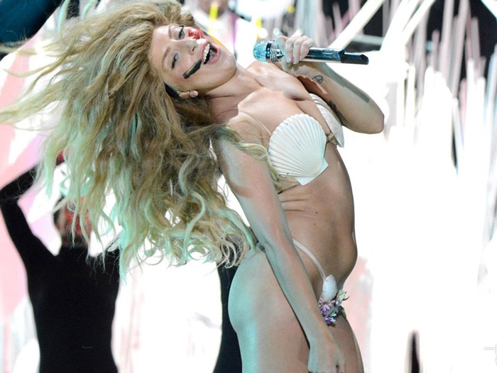 | Lady Gaga chèn ép cơ thể quá đà trong bộ trang phục của Eva trong phần trình diễn trên sân khấu MTV VMA ngày 25/8. |