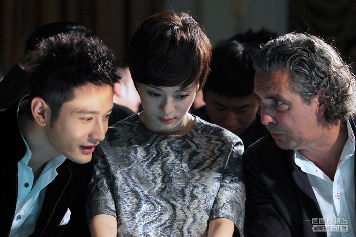 | Tôn Lệ ngồi yên bất động để cho Huỳnh Hiểu Minh trò chuyện với một người bạn ngoại quốc. Ảnh chụp tại một buổi trình diễn thời trang diễn ra ở Thượng Hải ngày 29/8. |