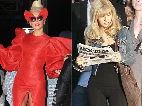| Lady Gaga diện chiếc váy xẻ quá cao còn Christina Aguilera mặc quầ bó mà lại không để ý đến vùng nhạy cảm. |