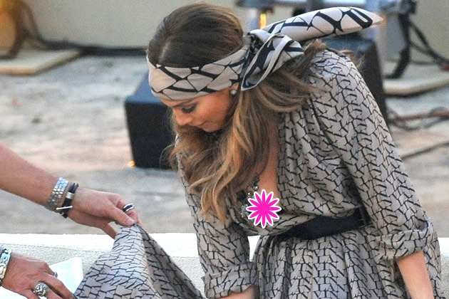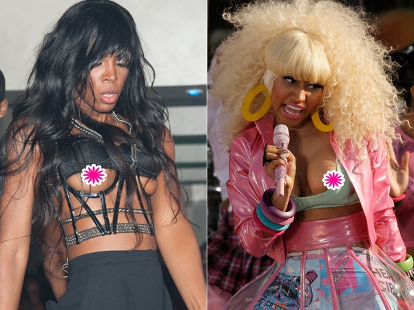 | Nhảy quá sung đã khiến chiếc áo hình áo ngực của Kelly Rowland (trái) bị kéo ngược lên trên và làm hở phần không được hở. Còn chiếc áo ngực màu xanh quá nhỏ bé nên không thể đỡ nổi bộ ngực đồ sộ của Nicki Minaj. |