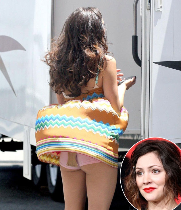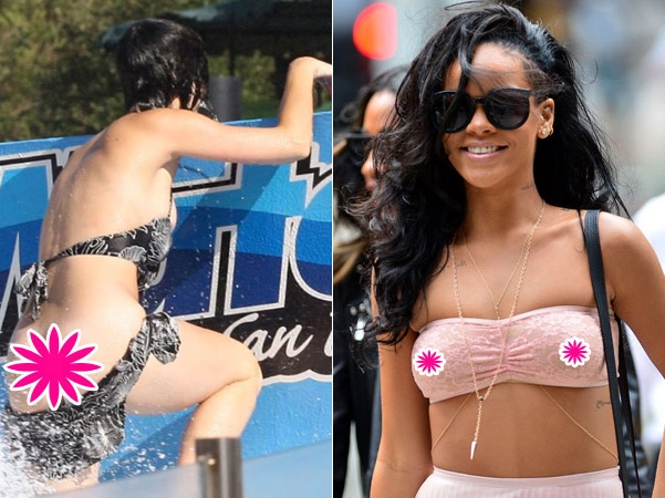| Bên trái là Katy Perry tụt quần khi bước từ bể bơi lên bờ. Bên phải là hình Rihanna tự tin xuống phố với bộ trang phục mỏng manh. |