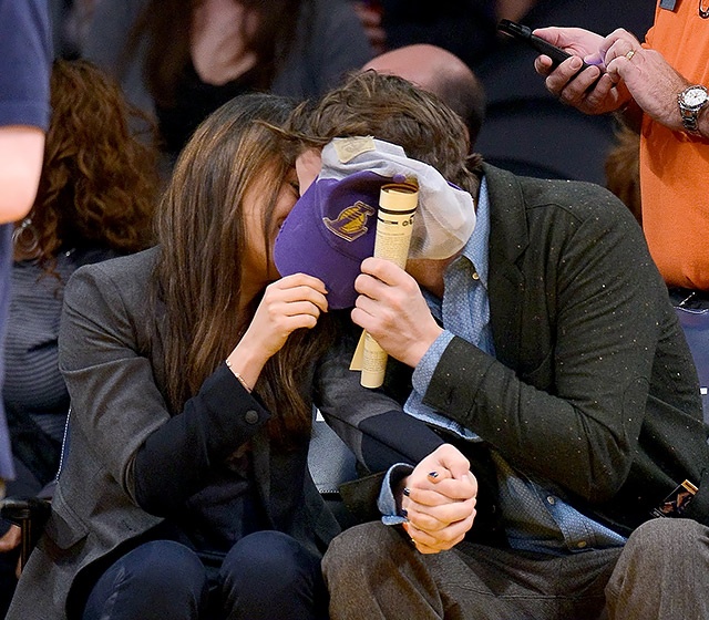 | Cũng tại một trận đấu của Lakers, Kiss Cam dừng lại đúng chỗ cặp đôi nổi tiếng Mila Kunis và Ashton Kutcher. Anh chồng Ashton đã hài hước lấy mũ che mặt khi hôn để tránh ống kính phóng viên. |
