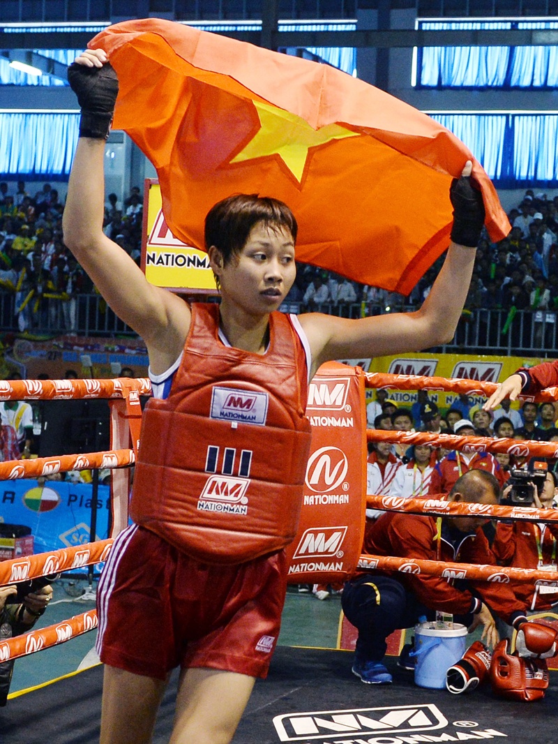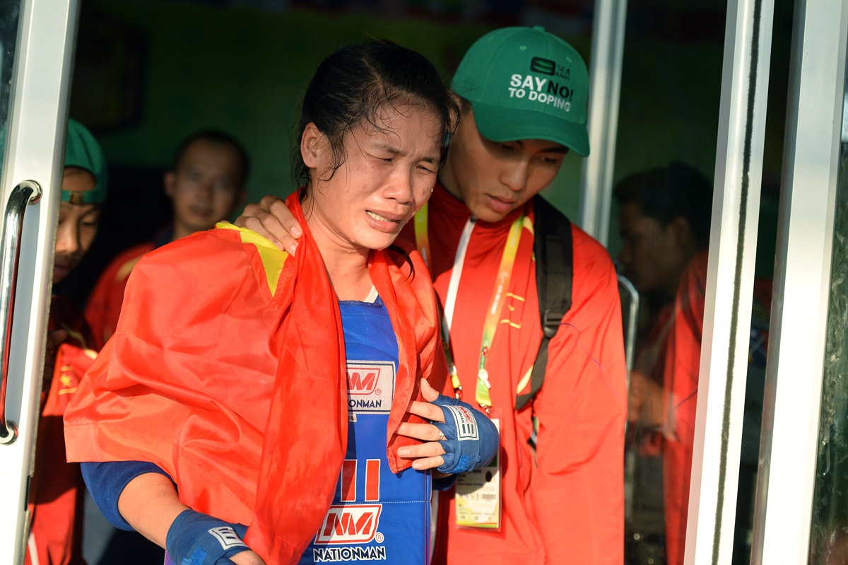 Võ sĩ Bùi Yến Ly ăn mừng tấm HCV sau khi đánh bại đối thủ Grace của Myanmar. Có thể hiểu được sự vui mừng của Yến Ly vì trước đó đồng đội của chị - Bùi Thị Quỳnh - bị xử ép trắng trợn, nhận thất bại khi gặp VĐV nước chủ nhà.