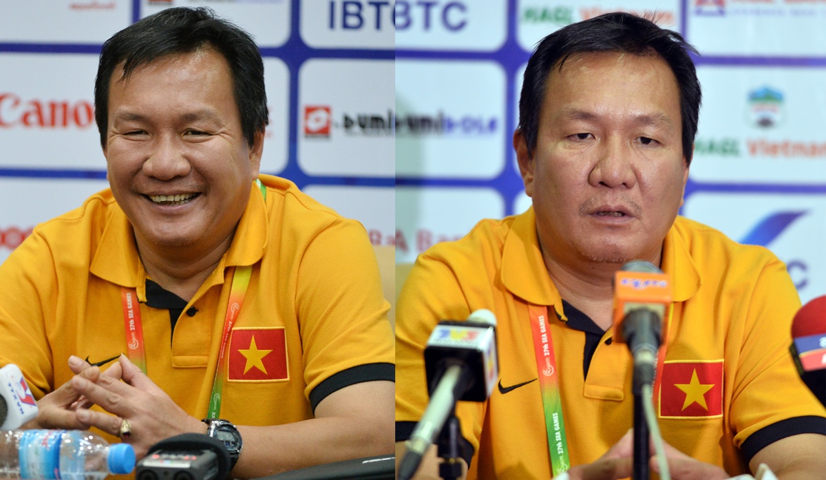Nụ cười rạng rỡ và khuôn mặt thẫn thờ của HLV Hoàng Văn Phúc tại hai buổi họp báo. Bên trái là sau trận thắng Lào 5-0 để nuôi hy vọng, ảnh phải là sau trận thua Malaysia 1-2, bị loại ngay từ vòng bảng.