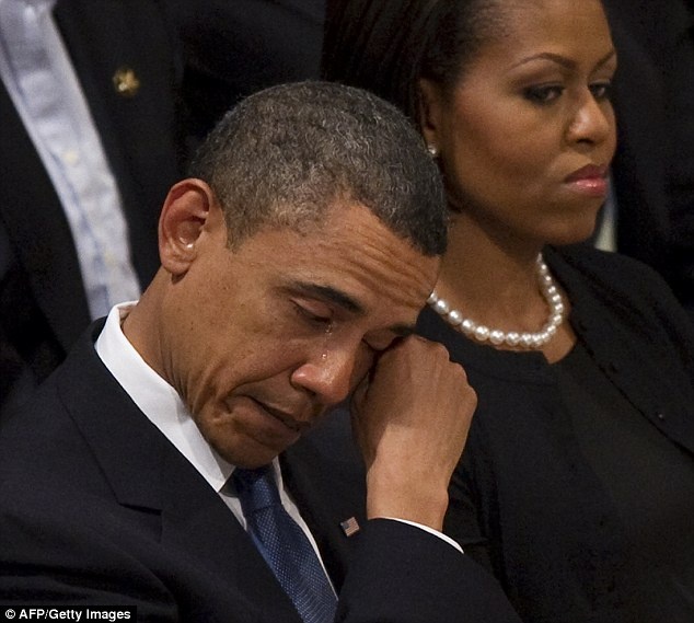 Giây phút không kìm được nước mắt của người đứng đầu Nhà Trắng khi ông gửi lời chia buồn sâu sắc tới các gia đình nạn nhân vụ xả súng tại trường tiểu học Sandy Hook bang Connecticut vào tháng 12/2012. "Suy nghĩ và những lời cầu nguyện của chúng ta là không hề đủ. Nó không thể hiện được hết nỗi đau khổ và giận dữ mà chúng ta cảm thấy, và không có tác dụng gì trong việc ngăn chặn cuộc tàn sát ở những nơi khác khắp nước Mỹ trong tuần tới hay vài tháng nữa", Obama nói. Ảnh: IBTimes