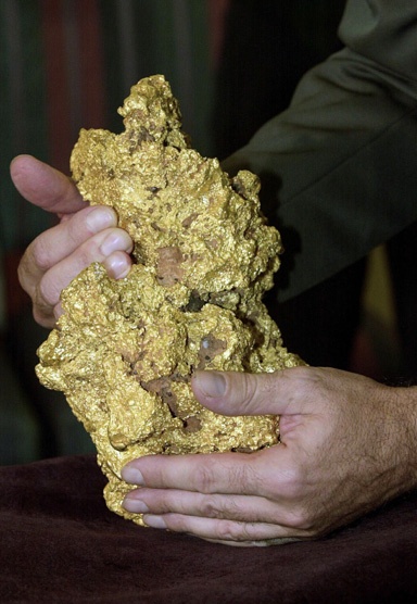 Cũng tại Australia, người ta đã phát hiện một thỏi vàng khổng lồ hình tảng đá nặng 68 kg. Các thợ mỏ tìm thấy nó ở khu khai thác vàng Ballart, bang Victoria hôm 9/6/1858. Hai thợ mỏ đầu tiên đã ngất xỉu khi nhìn thấy nó. Người ta nấu chảy khối vàng để làm những đồng xu nhưng sau này khối vàng ban đầu được phục dựng với trọng lượng 69 kg. Tính tới thời điểm hiện tại, nó vẫn là khối vàng lớn thứ hai mà con người tìm thấy trên trái đất. |