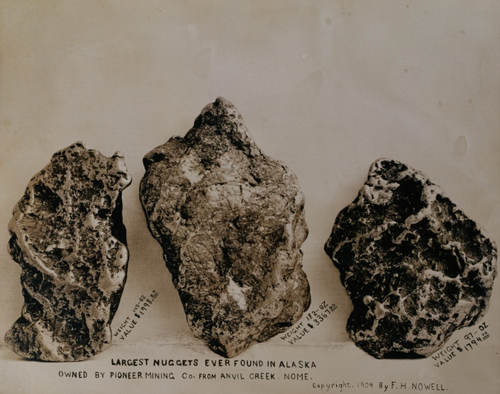 Bên cạnh những “vựa vàng” truyền thống, người ta cũng bắt đầu tới Alaska, phần đất tách biệt của nước Mỹ để tìm vàng từ năm 1899. Tại đây, những khối vàng nặng 3 kg, 5,1 kg và 2,7 kg (từ trái qua phải) lần lượt được tìm thấy. |
