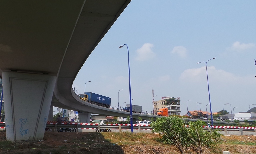 | Một hệ thống cầu vượt quan trọng khác tại cửa ngõ TP.HCM đi các tỉnh miền Đông Nam bộ, miền Bắc và ngược lại là cầu Thủ Đức, hay còn gọi là cầu Trạm Hai. Cầu vượt này nối tuyến quốc lộ 1A và xa lộ Hà Nội, dành cho tất cả các loại xe lưu thông 2 chiều. Cầu vượt Thủ Đức còn được thiết kế nhiều đường dẫn dành cho các loại xe lên - xuống từ nhiều hướng. Trong ảnh là đoạn cua nguy hiểm tại cầu vượt Thủ Đức. Đây là nhánh đường để xe đi từ quốc lộ 1A vào xa lộ Hà Nội và ngược lại. Đoạn cua quá cong gần như khiến các tài xế điều khiển xe chạy vòng tròn, và đã xảy ra nhiều tai nạn nghiêm trọng. |