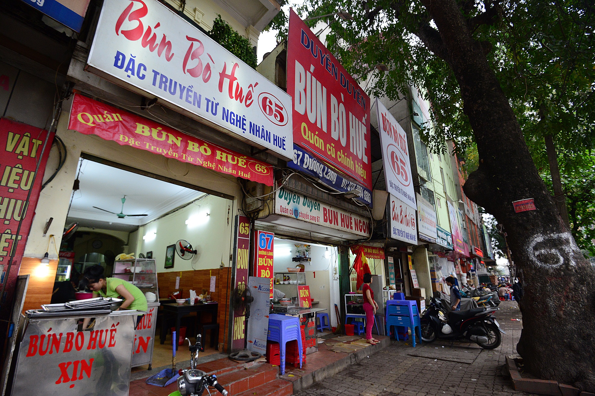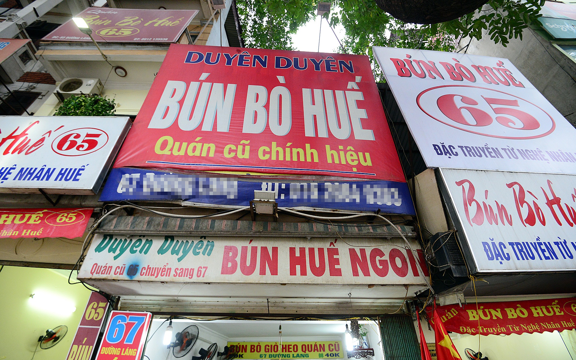 | Kỳ lạ ở chỗ, hai cửa hàng hai bên đều mang tên "Bún bò Huế 65 - Đặc truyền từ nghệ nhân Huế". Trong khi, quán bún bò Huế ở giữa lại ghi "Quán cũ 65 chuyển sang 67 - Quán cũ chính hiệu", khiến nhiều người không biết đâu mới là quán "xịn". Theo chủ quán Bún bò Huế 65, quán Bún bò Huế 67 ban đầu là khác chủ. Sắp tới, chủ của cửa hàng 67 sẽ nhượng lại quán, và chị thống nhất để biển Bún bò Huế 65. |