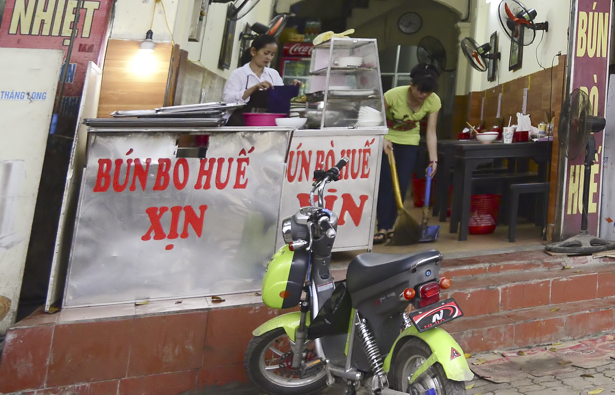 | Để khẳng định thương hiệu, trên bếp và tủ đựng nguyên liệu của một quán bún còn dán dòng chữ " Bún bò Huế xịn". |