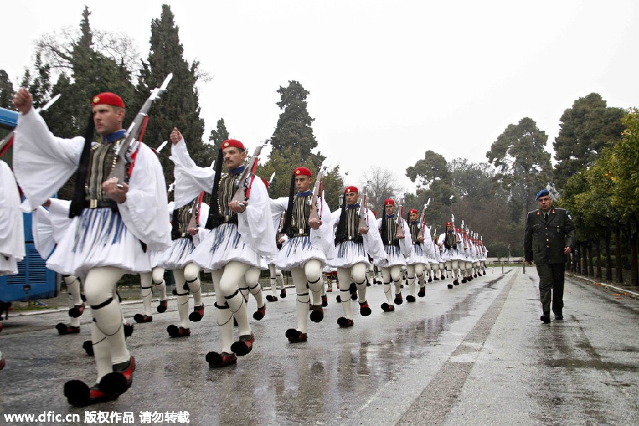 Lực lượng Vệ binh Hy Lạp trong trang phục độc đáo tại lễ diễu hành nhân ngày Quốc khánh nước này tại thủ đô Athens, hôm 25/3/2015. Ngày khởi đầu của cuộc nổi dậy chống đội quân Ottoman năm 1821 được chọn làm Ngày Độc lập của Hy Lạp. |