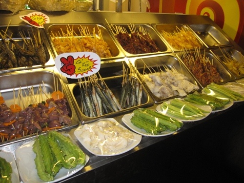 Món nướng không lạ, hình thức xiên que càng không, nhưng kết hợp hai điều đó lại tạo nên một cái gì đó mới lạ, nhẹ nhàng với giới trẻ. Tới quán, thực khách được nhân viên trao tận tay dĩa cùng kẹp gắp, rồi đi đến quầy chọn từng xiên theo ý thích.