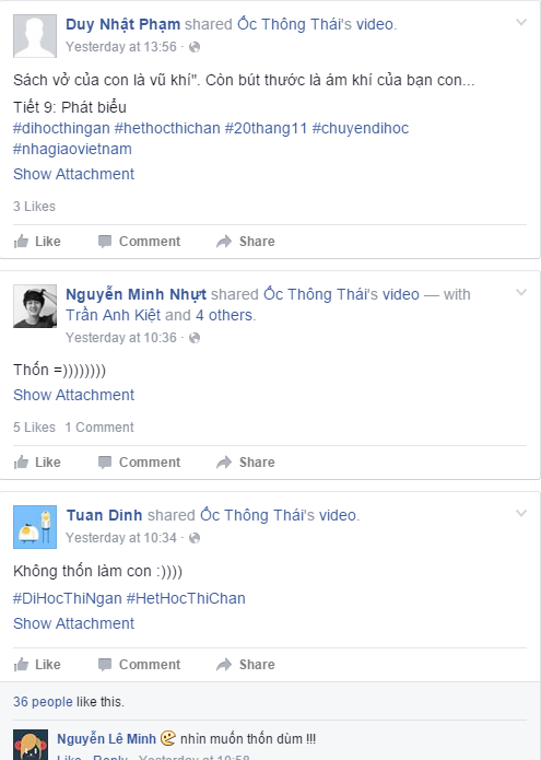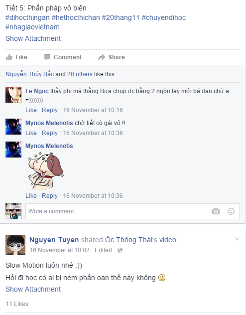 Với mong muốn gợi lại những kỷ niệm đáng nhớ thời đi học và chào mừng ngày nhà giáo Việt Nam 20/11, một clip ngắn, hài hước "#dihocthingan #hethocthichan" (đi học thì ngán, hết học thì chán) đã được tung ra. Nội dung kể về những chuyện vui nho nhỏ xoay quanh bạn bè, thầy cô trong những tháng ngày mài đũng quần trên ghế nhà trường.
