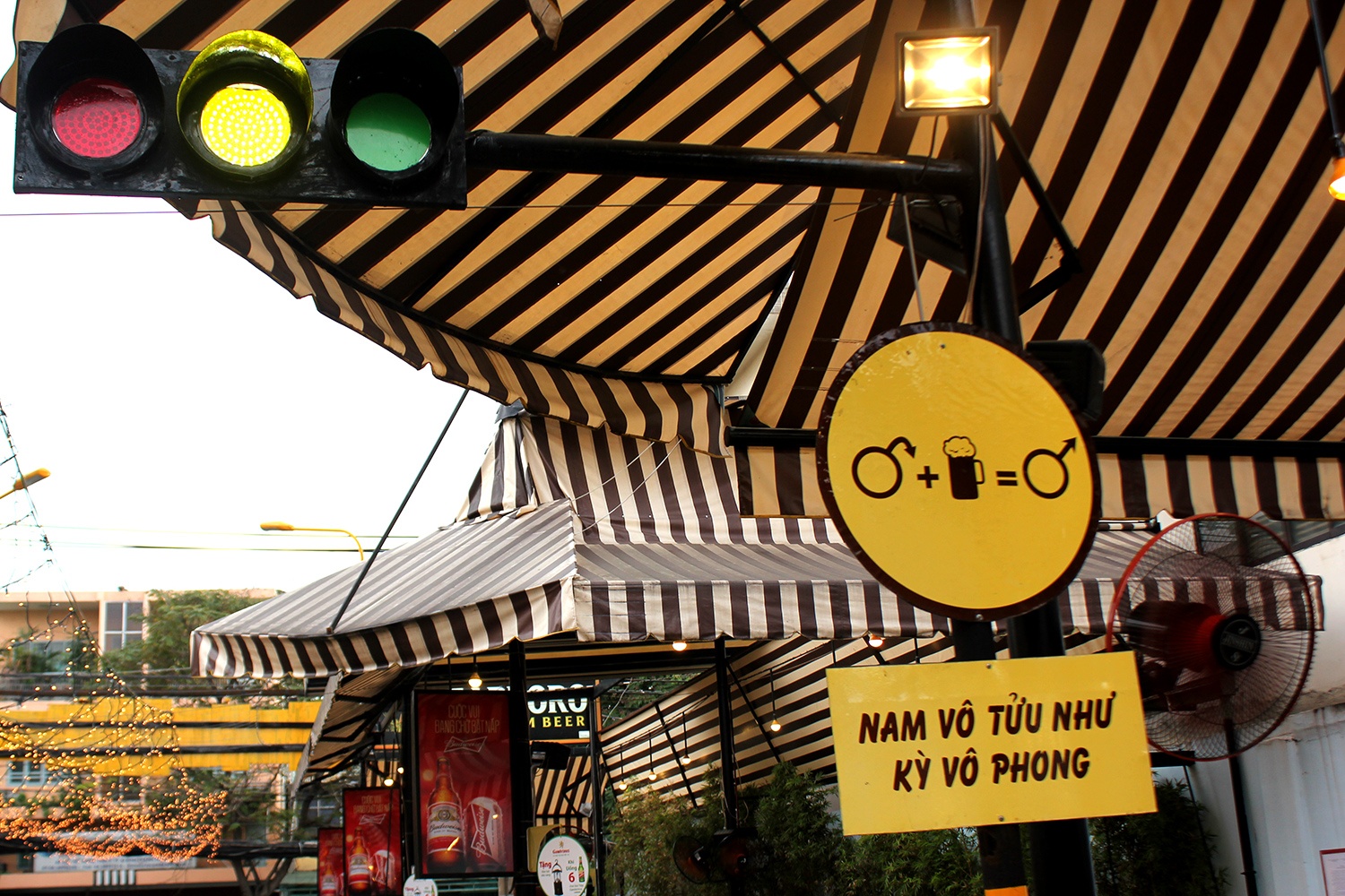 | Một quán nhậu phong cách đường phố trên đường Xô Viết Nghệ Tĩnh, quận Bình Thạnh đã đặt rất nhiều bảng báo lạ lùng dành riêng cho dân nhậu khi đến đây. |