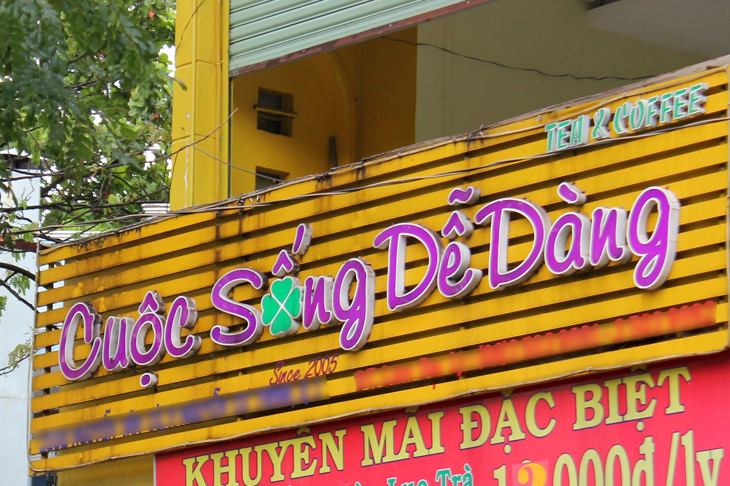 | Bên cạnh lạ để "phục vụ dân nhậu", nhiều quán cà phê, trà cũng tạo ấn tượng níu khách với những cái tên sáng tạo có một không hai. Một quán cà phê, trà trên đường Nguyễn Văn Cừ quận 5 hút khách với cái tên dễ thương: " Cuộc Sống Dễ Dàng". Bảng tên quán với màu sắc nổi bật giữa rừng bảng quảng cáo của các quán lân cận. |