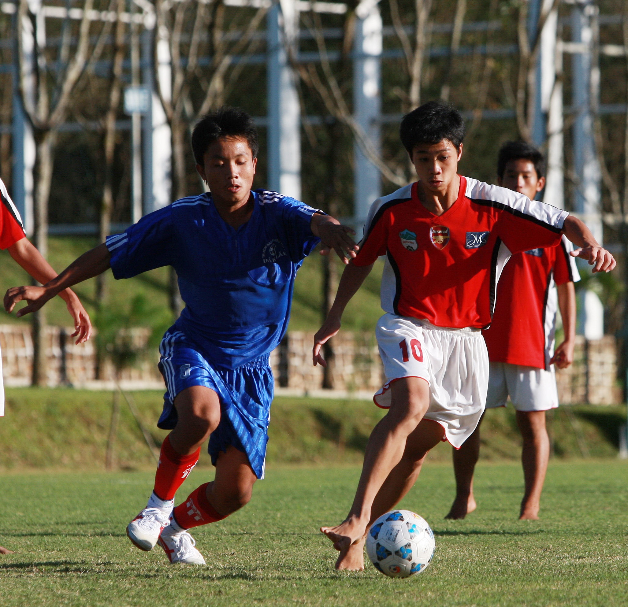 | Công Phượng với mái tóc vàng vì cháy nắng khéo léo thể hiện kỹ thuật với bóng bằng chân đất và là 1 trong 5 em trúng tuyển vào Học viện. |