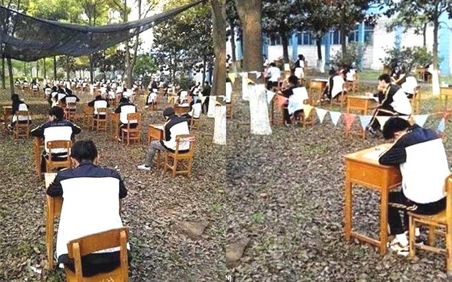 Tháng 4/2015, ban lãnh đạo một trường trung học ở thành phố Cẩm Châu, tỉnh Hồ Bắc, cũng áp dụng phương pháp này. Hiệu trưởng nhà trường quyết định tổ chức kỳ thi cuối kỳ trong rừng với mong muốn giúp học sinh vượt qua nắng nóng để làm bài tốt và chống gian lận. Ảnh: Daily Mail.