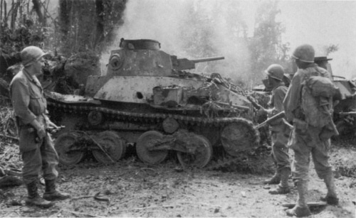 | Binh sĩ thuộc Sư đoàn 32 của Mỹ kiểm tra những xác xe tăng Nhật Bản trong một trận đánh tại Leyte vào tháng 12/1944. Ảnh: axishistory.com |